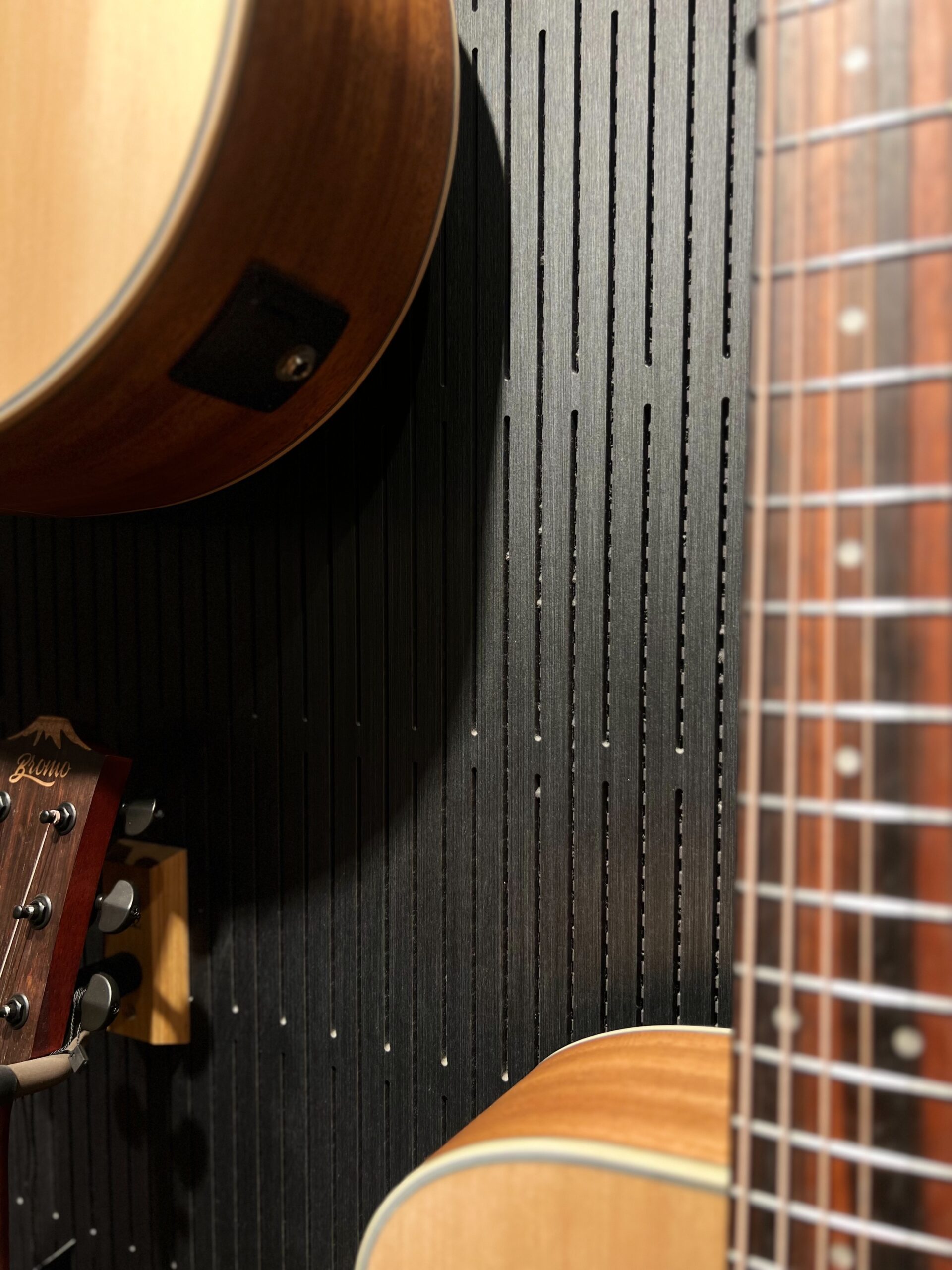 Behind each guitar is a backdrop crafted from grooved Forescolor MDF, laminated with a sophisticated matte finish. The Fall Pattern from SENSO creates a repetitive slot texture that echoes the form of sound waves—making it the perfect canvas for showcasing acoustic instruments.